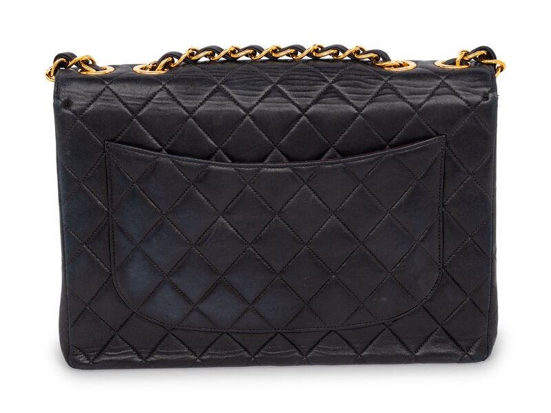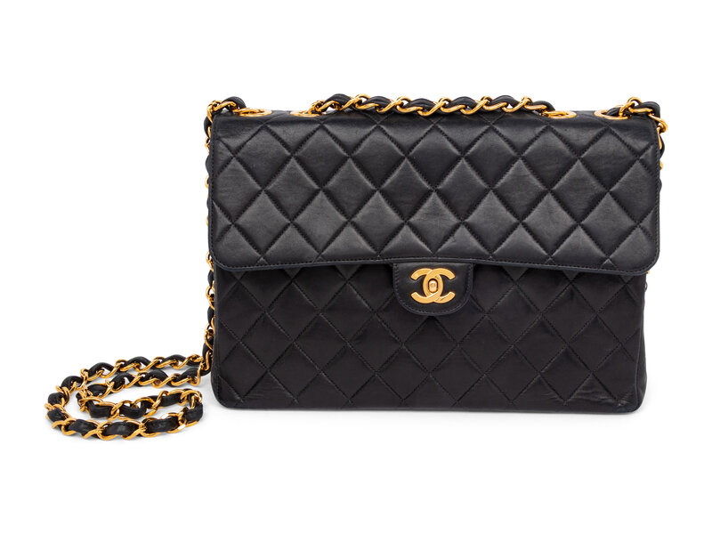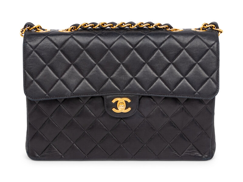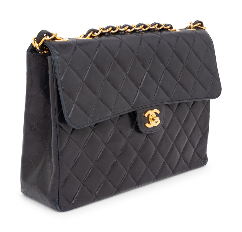 Chanel jumbo square classic flap shoulder bag in quilted with 24k gold-plated hardware. CC turn-lock closure and interwoven metal-leather chain strap.