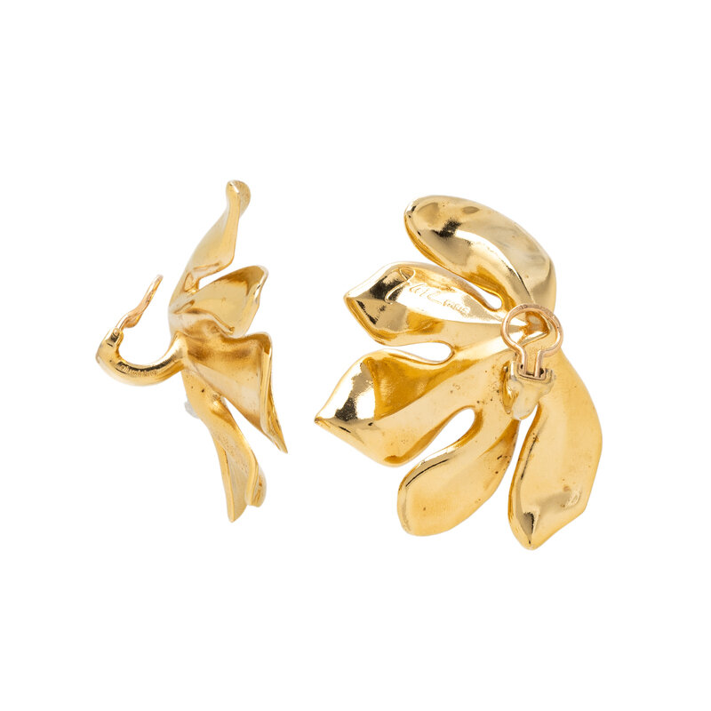 Bright finish golden aluminum with 18k yellow gold clip backs. 2 1/2 inches long.