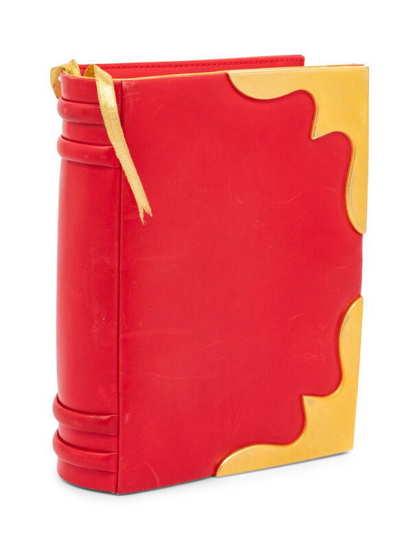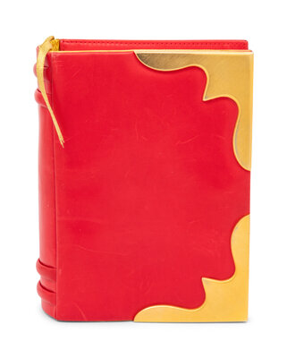 Evening 'book' bag in red and metallic gold leather with gold-tone metal accents. Magnetic snap closure.
