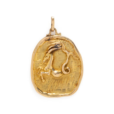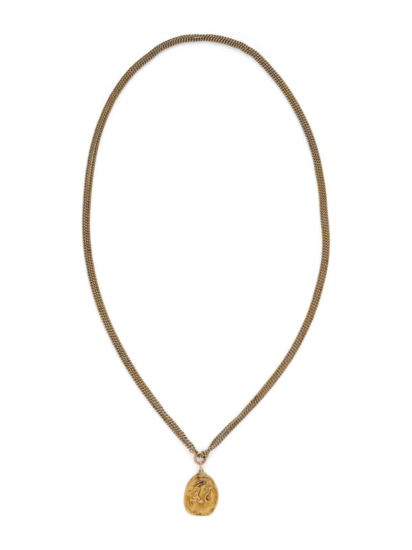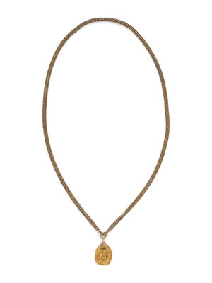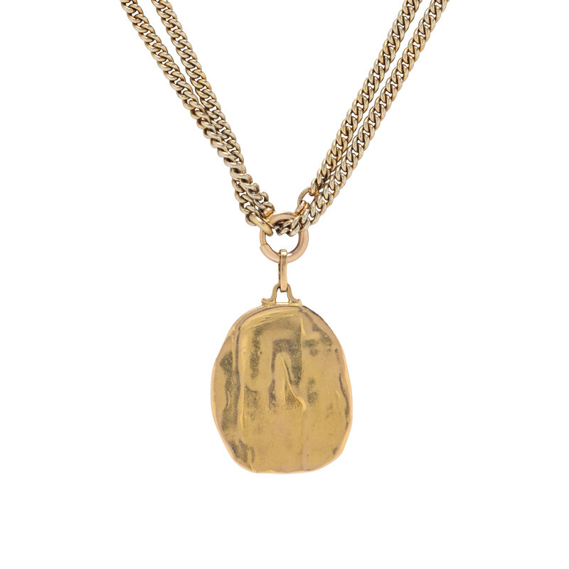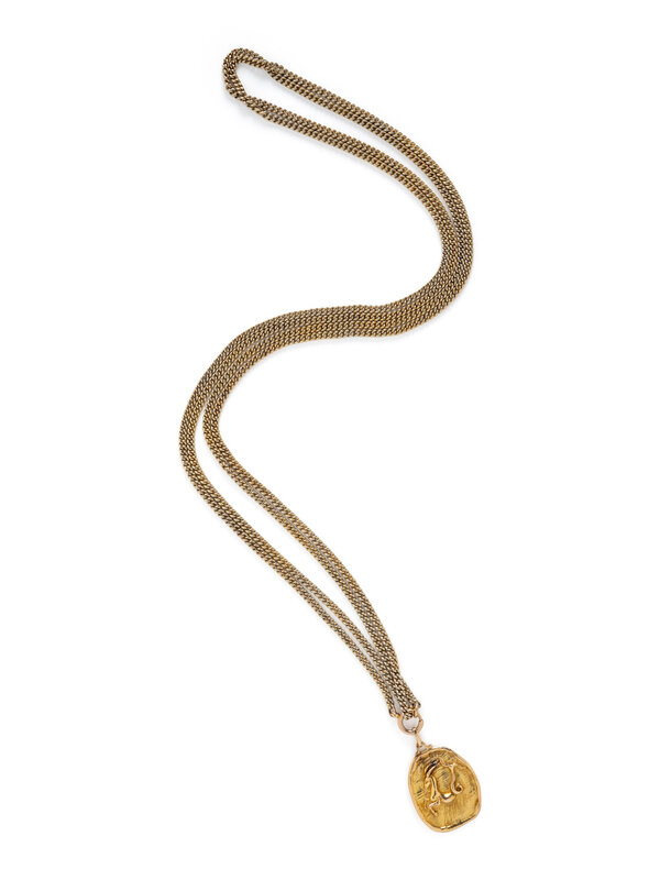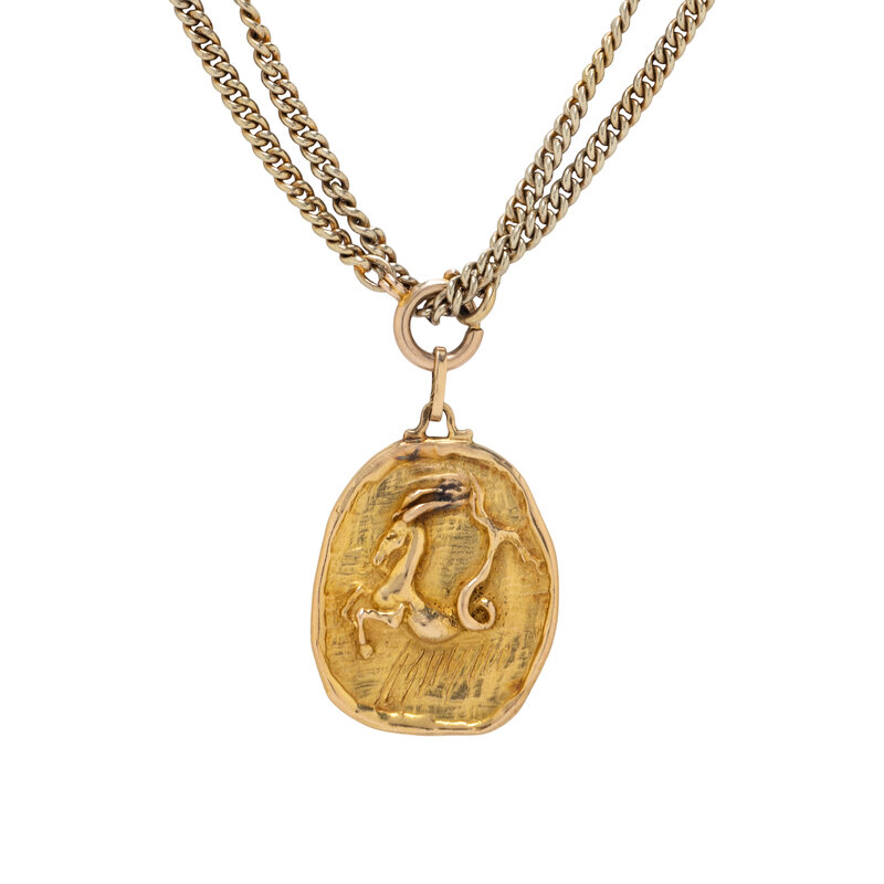 Yellow gold. Pendant: 1 1/2 x 1 inches. Chain: 64 inches long.