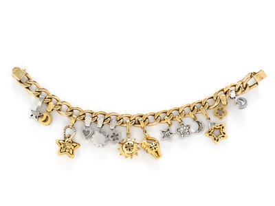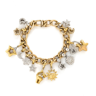 Fourteen charms, all set with round diamonds. Yellow and white gold. 7 1/2 inches long.