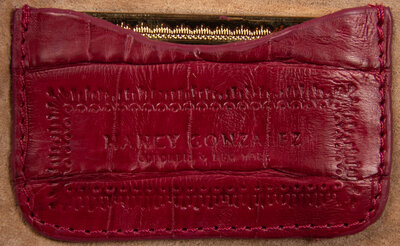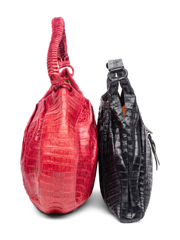 Tote bag in berry red crocodile skin. Magnetic snap and loop & knot closures and woven crocodile skin handle.