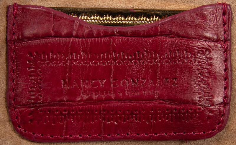 Details: Gold-tone hardware, magnetic snap closure, loop & knot closure, exterior pockets, beige suede lining, interior slip pockets, interior zipper pocket