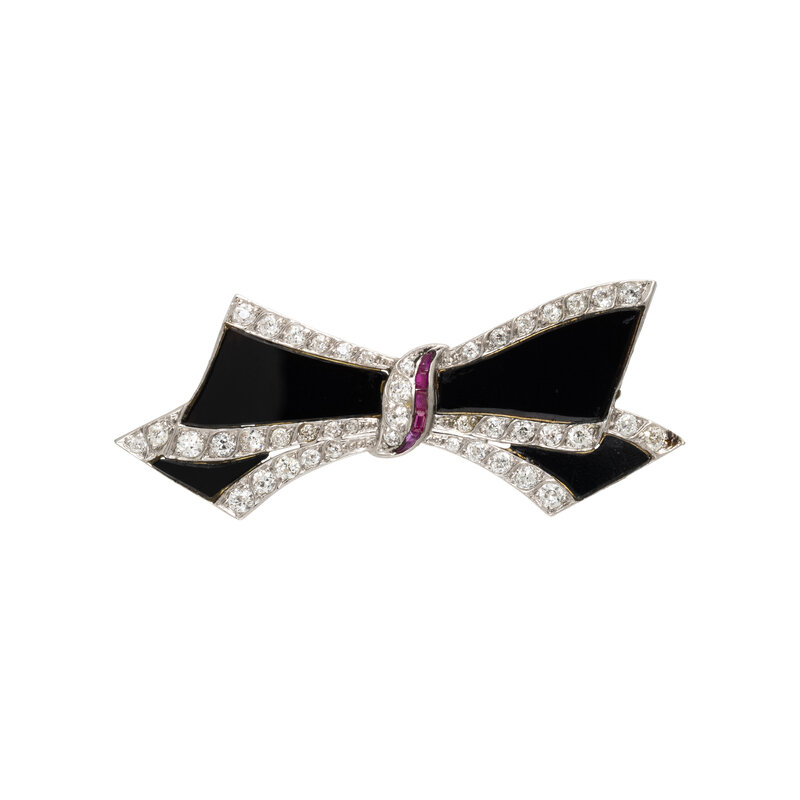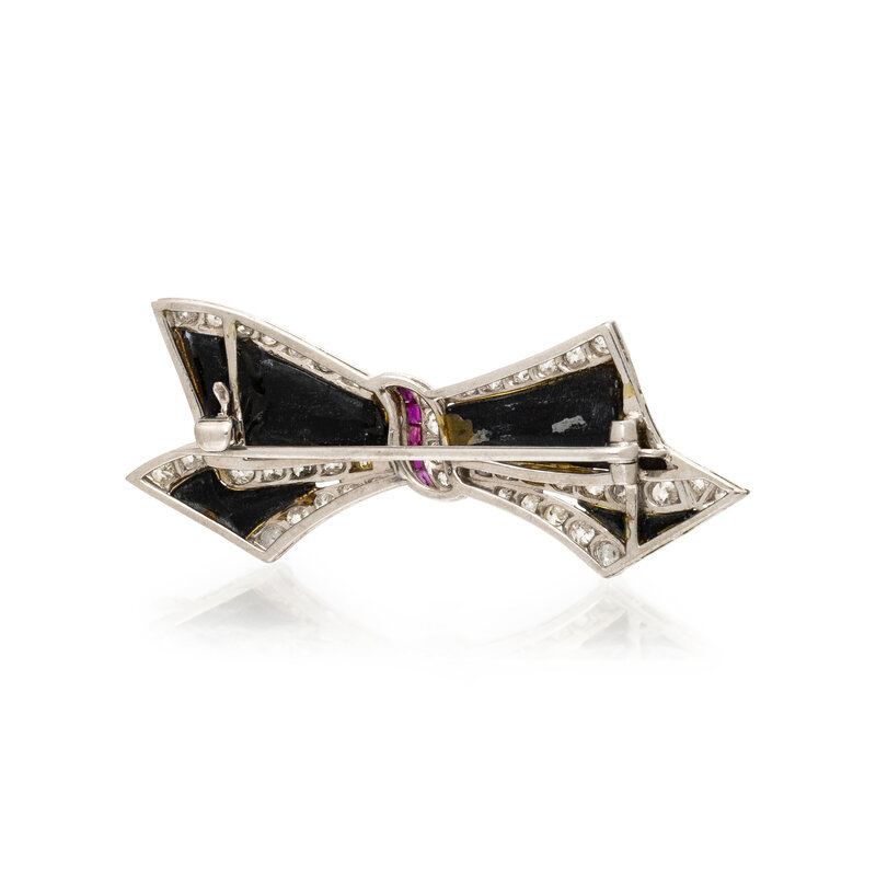 ONYX, RUBY, AND DIAMOND BOW BROOCH