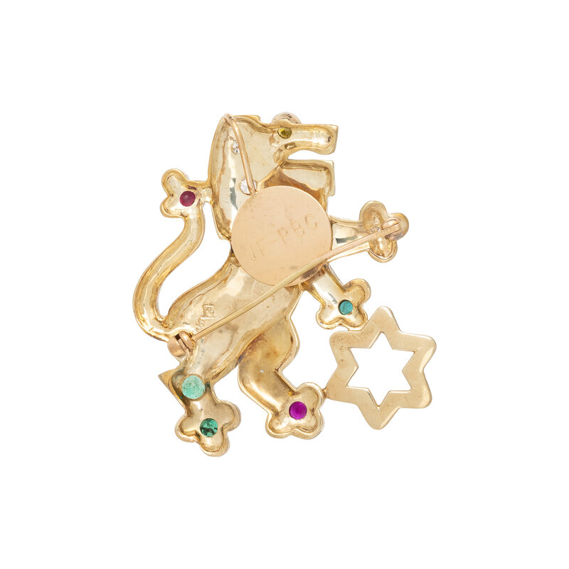 YELLOW DIAMOND, DIAMOND, EMERALD, AND RUBY LION BROOCH