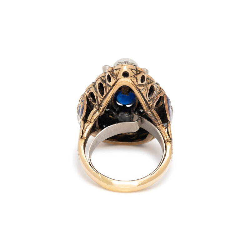 Oval cabochon sapphire measuring approximately 9.70 x 6.30 mm, cultured pearls, old European and rose cut diamonds, and blue enamel. Yellow gold. Ring size 7.