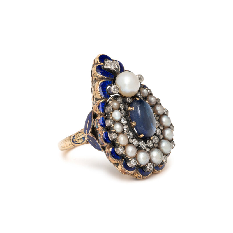 ANTIQUE, SAPPHIRE, DIAMOND, CULTURED PEARL AND ENAMEL RING