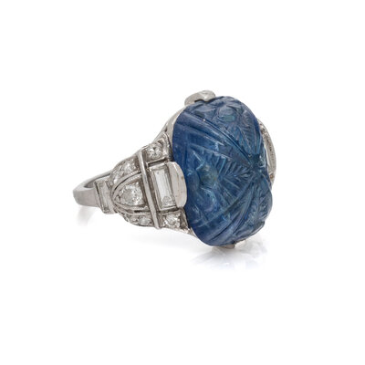 ART DECO, CARVED SAPPHIRE AND DIAMOND RING