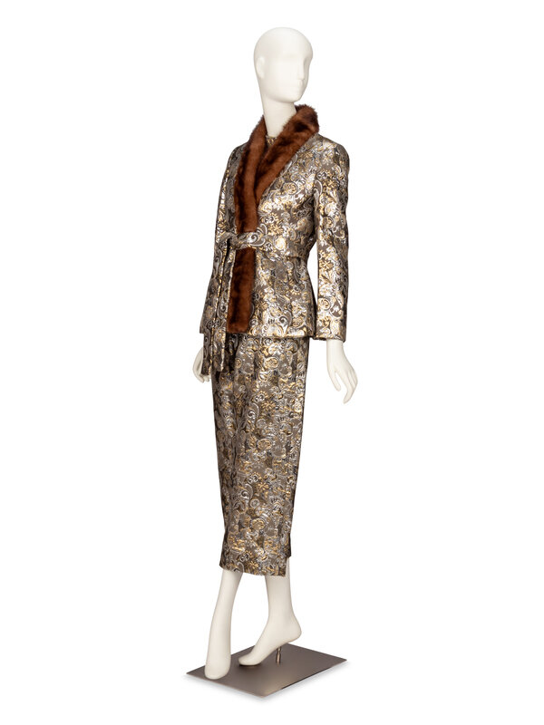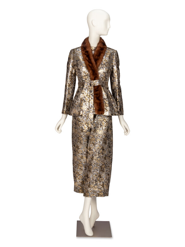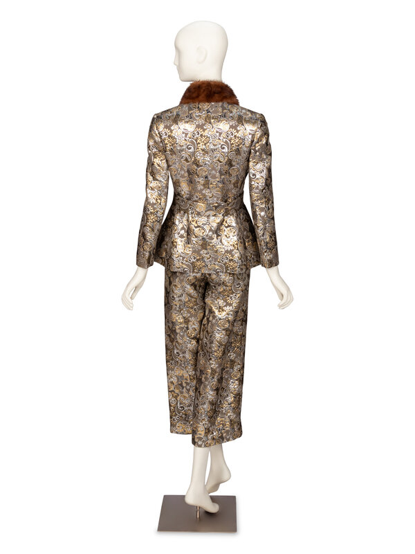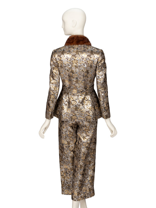 Wrap-style jacket in gold & silver lamé brocade with brown fur trim. Shawl collar. Wrist-length set-in sleeves. Fitted silhouette with slight flare at hips. Two in-seam pockets at front. Concealed snap & hook-and-eye closures at interior. Fully lined. With detached self-fabric belt.