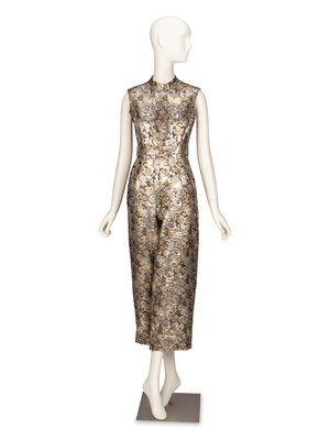 Sleeveless jumpsuit in gold & silver lamé brocade. Stand collar. Fitted bodice with attached belt waistband. Wider copped pant legs. Concealed zipper and hook-and-eye closures at back. Fully lined.