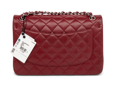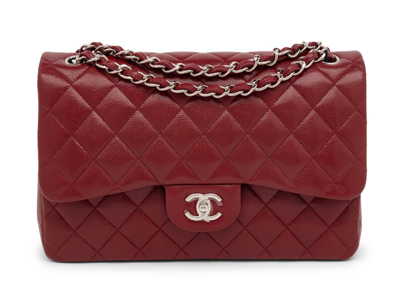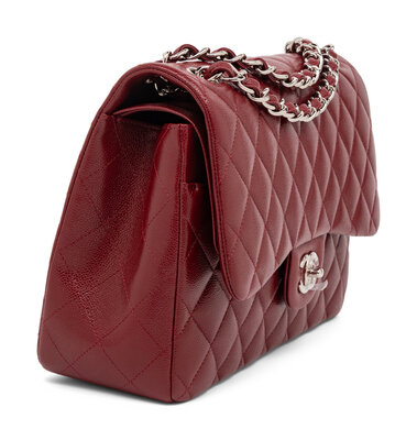 Chanel large double flap shoulder bag in quilted burgundy caviar leather with silver-tone hardware. CC turn-lock closure and interwoven metal-leather chain strap.