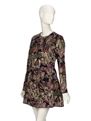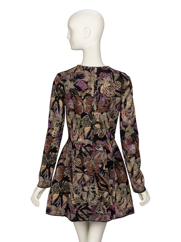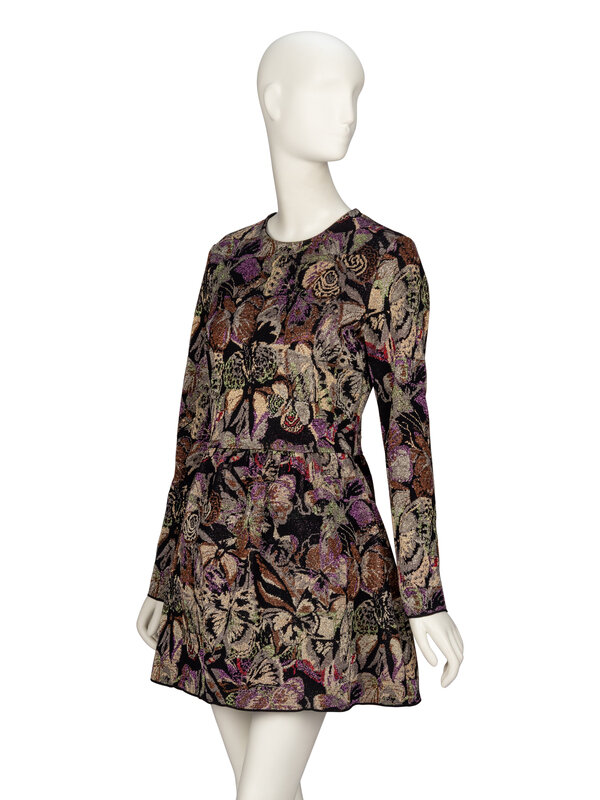Minidress in multicolor metallic jacquard knit, featuring an all over butterfly-camouflage. Slight stretch to the knit. Round neckline. Full-length long sleeves. Fitted bodice and gathered mini skirt. Invisible zipper closure at back. Unlined.