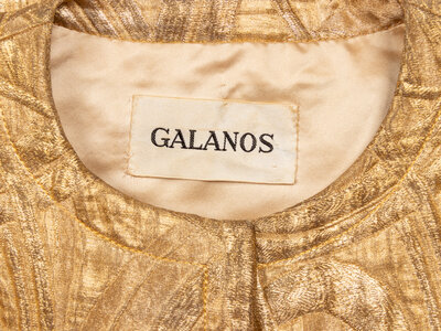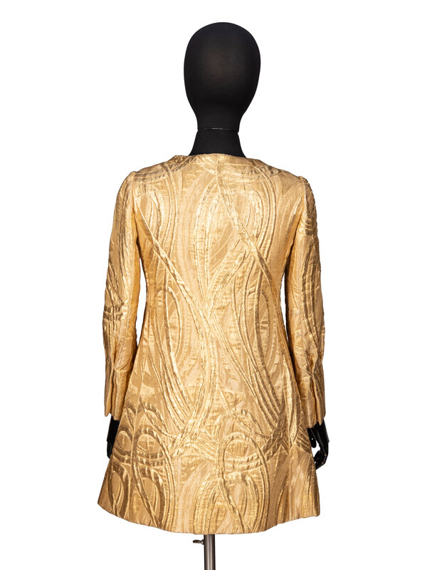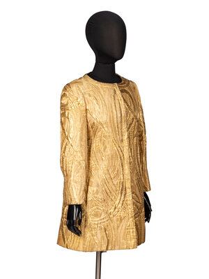 Evening jacket in metallic gold lamé brocade. Round, collarless neckline. Wrist-length set-in sleeves. Three-quarter length bodice with fit-and-flare silhouette. Two in-seam pockets at front. Concealed button closures at front with metallic gold-tone buttons; two snap closures at neckline. Fully lined.
