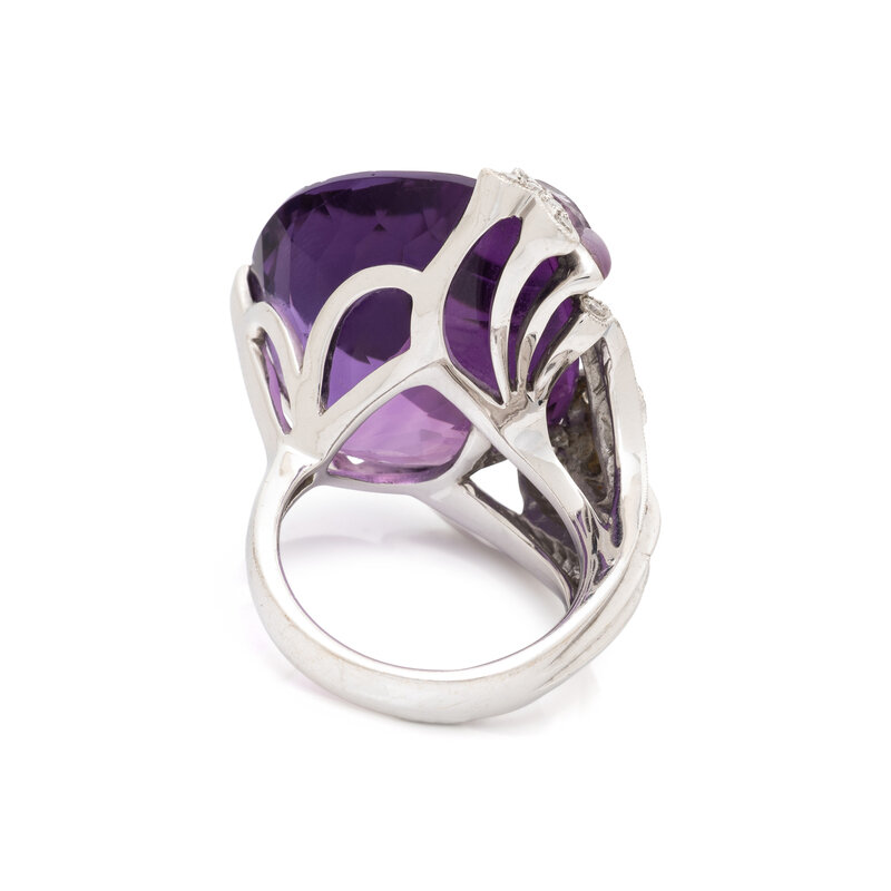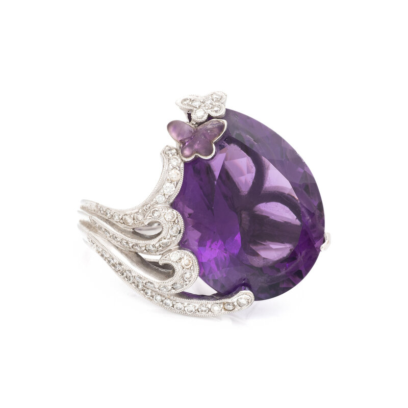 Pear shaped amethyst weighing approximately 33.00 by formula, with round diamonds weighing approximately 0.70 carat and a carved amethyst butterfly. 18 karat white gold. Ring size 6 3/4.