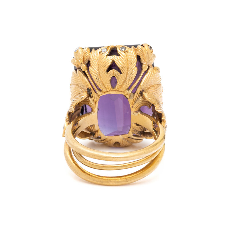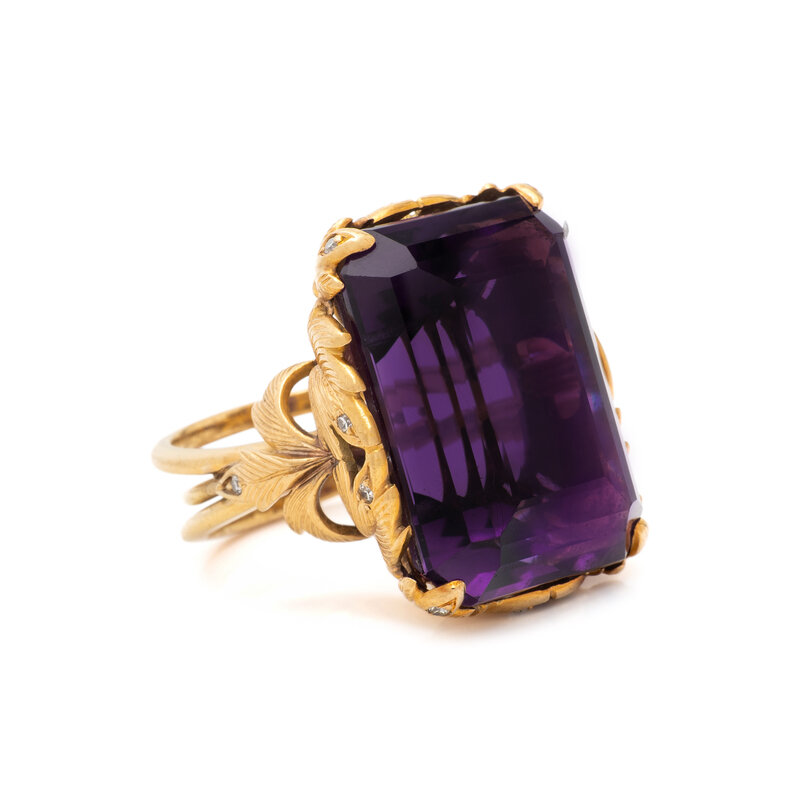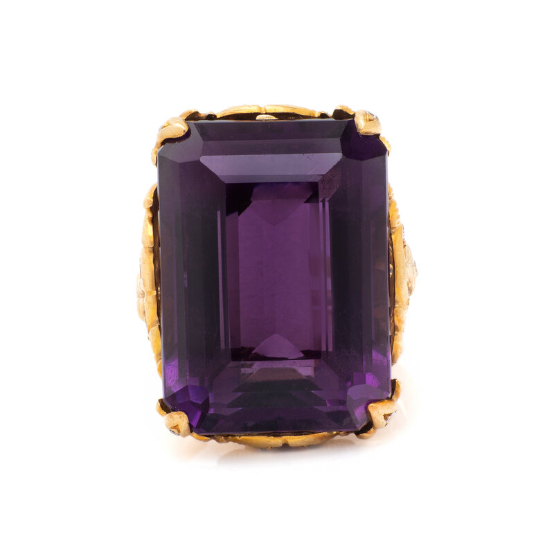 Emerald cut amethyst weighing approximately 41.00 carats by formula, and single cut diamonds. Yellow gold. Ring size 8.