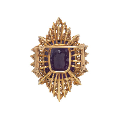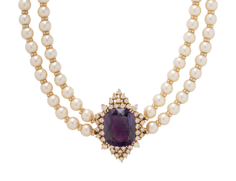 With two strands of cultured pearls measuring approximately 7.50 - 8.00 mm separated by gold rondelles, the clasp containing a detachable brooch pendant set with a cushion cut amethyst weighing approximately 24.50 carats by formula and round diamonds weighing approximately 3.25 carats total. Yellow gold. 15 inches long.