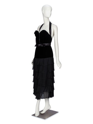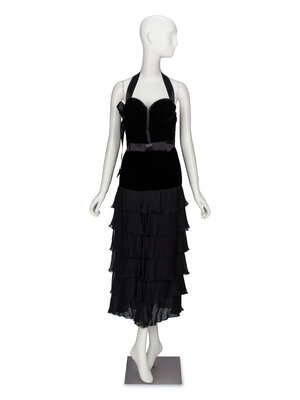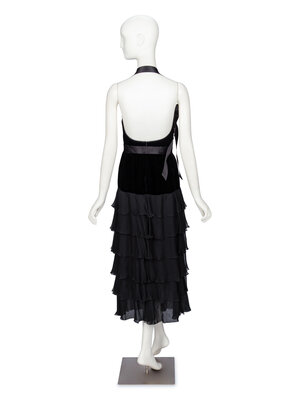 Halter dress in black silk velvet with black satin trim and a tiered skirt of black chiffon ruffles. Sweetheart neckline with lightly padded cups and underwires. Satin ribbon halter strap; attached ribbon bow at side bodice. Concealed zipper closure at back bodice; snap and hook-and-eye closures at back waist ribbon. Fully lined.