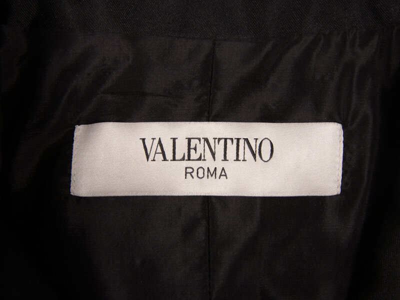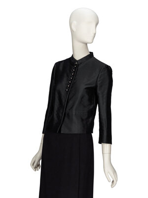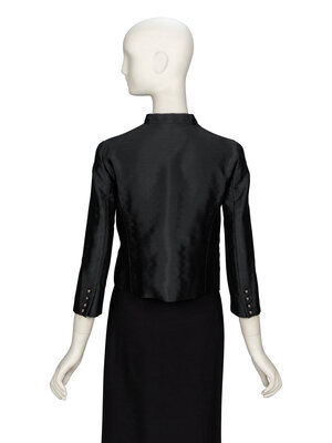 Cropped & fitted evening jacket in glossy wool-blend twill. Short stand collar. Three-quarter-length set-in sleeves with decorative buttons at sleeve hems. Two besom pockets at front. Half-ball button closures at upper chest; two concealed snap closures at waist. Fully lined.
