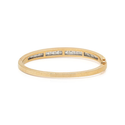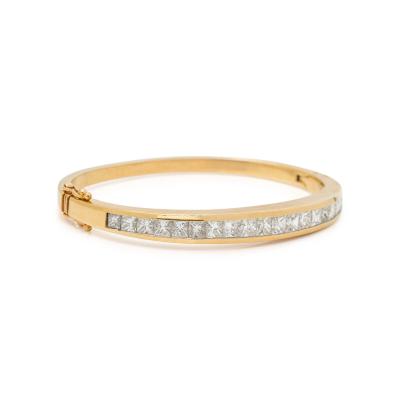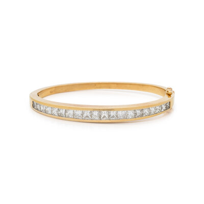 Princess cut diamonds weighing approximately 4.50 - 5.00 carats total, hinged with side clasp. 18 karat yellow gold. 6 inches inner circumference.