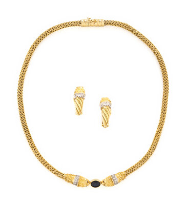 Including a pair of earrings set with round diamonds and rubies, and a necklace set with round rubies and diamonds and an oval cut sapphire weighing approximately 1.50 carats. 18 karat yellow and white gold. Earrings: 1 inch long. Necklace: 17 inches long.