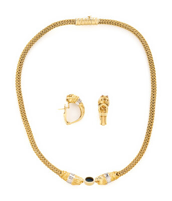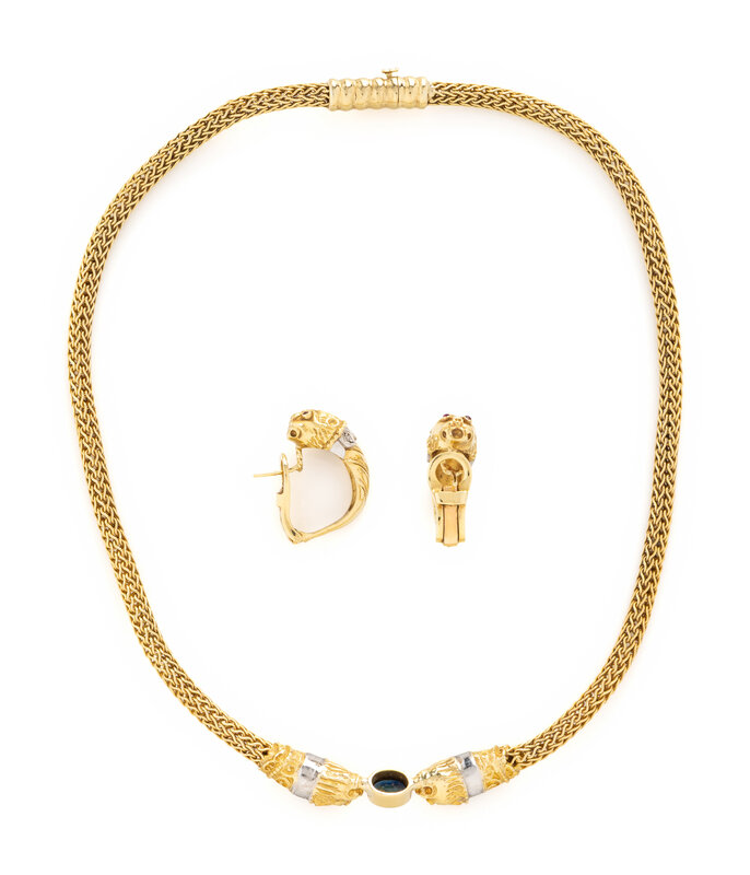 YELLOW GOLD AND MULTIGEM LION NECKLACE AND EARRINGS SET