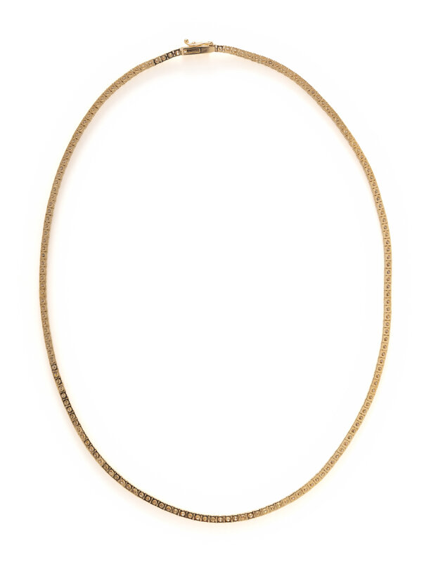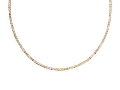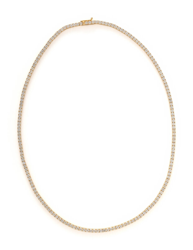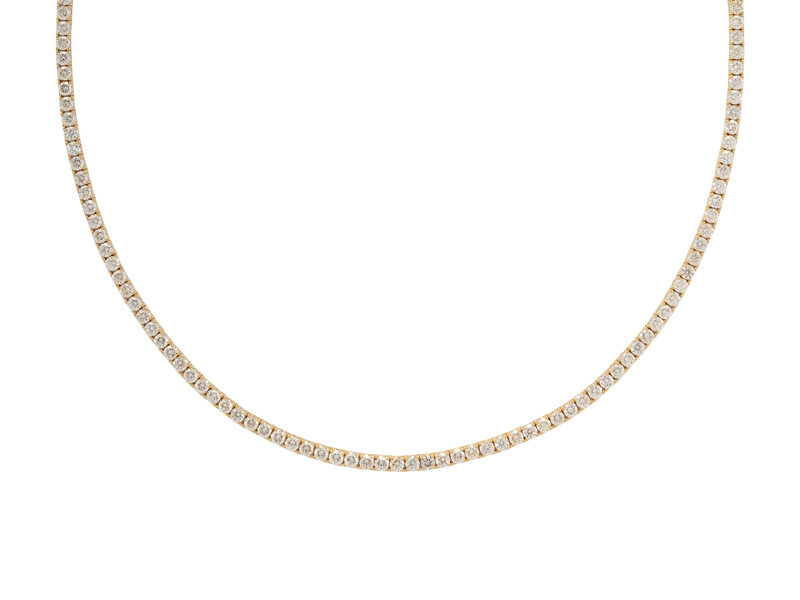 Set with round diamonds weighing approximately 10.00 - 11.00 carats total. Mounted in 14 karat yellow gold. 18 inches long.