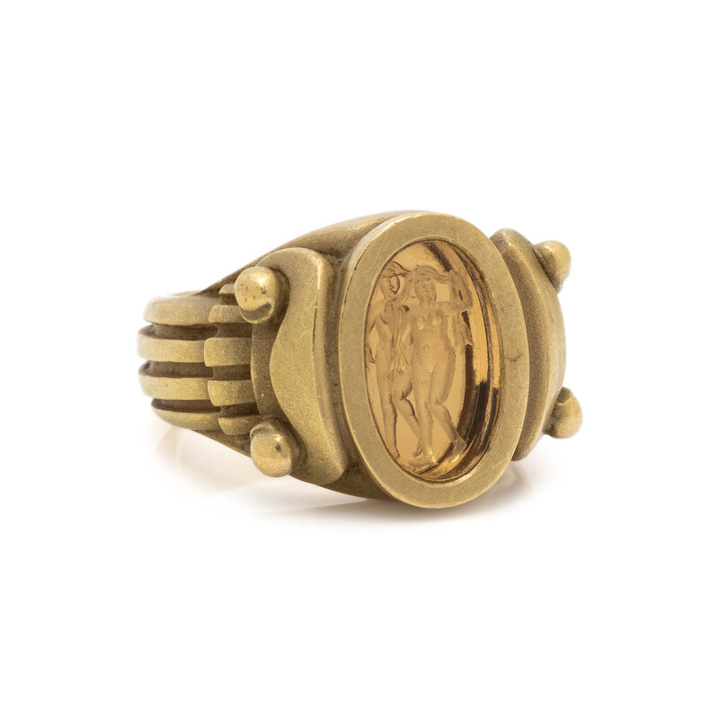 Intaglio depicting a female figure. 18 karat yellow gold. Ring size 4 1/2.