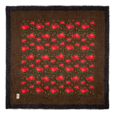 Multicolor-printed wool shawl with frayed edges. Features rose and houndstooth motifs.