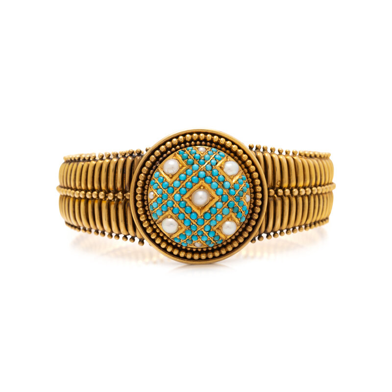 ANTIQUE, TURQUOISE, CULTURED PEARL, AND YELLOW GOLD BRACELET