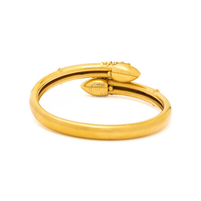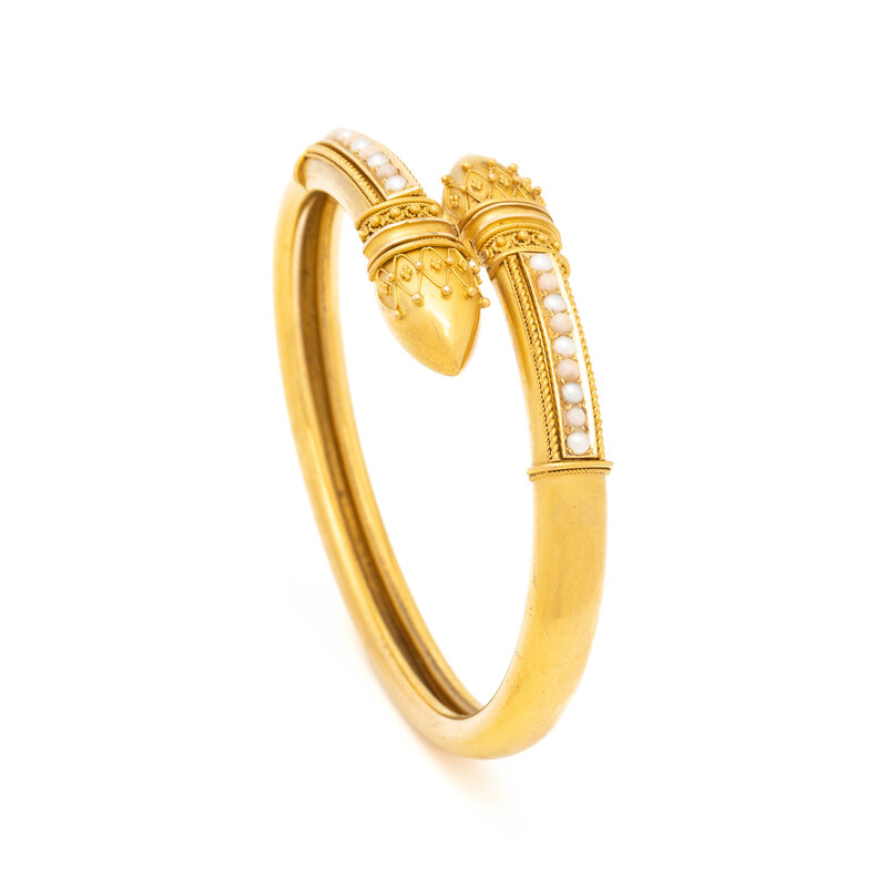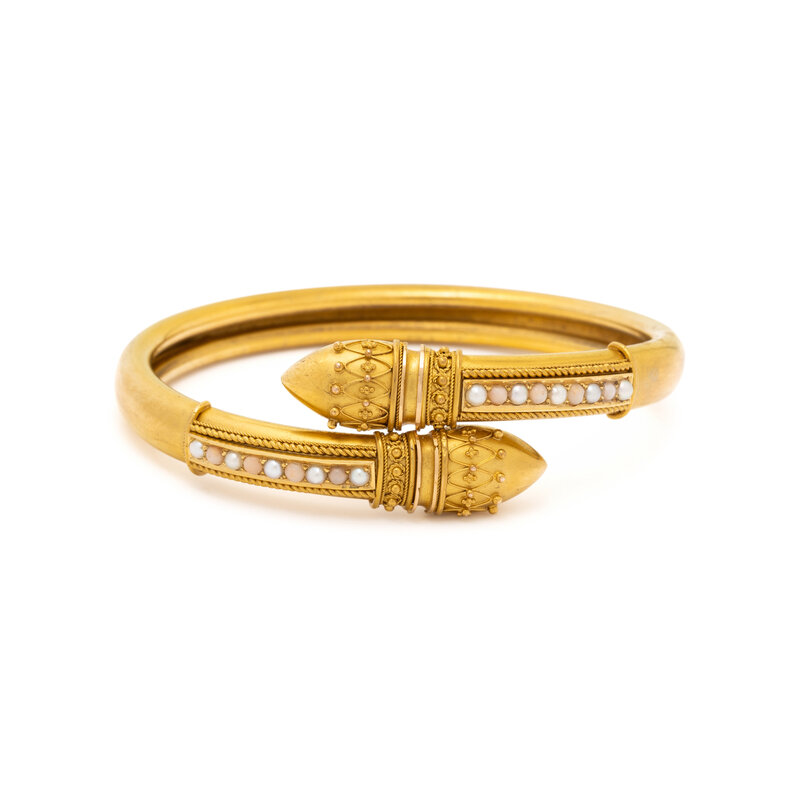 Seed pearls and round cabochon coral. Yellow gold. 6 1/4 inches inner circumference.