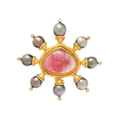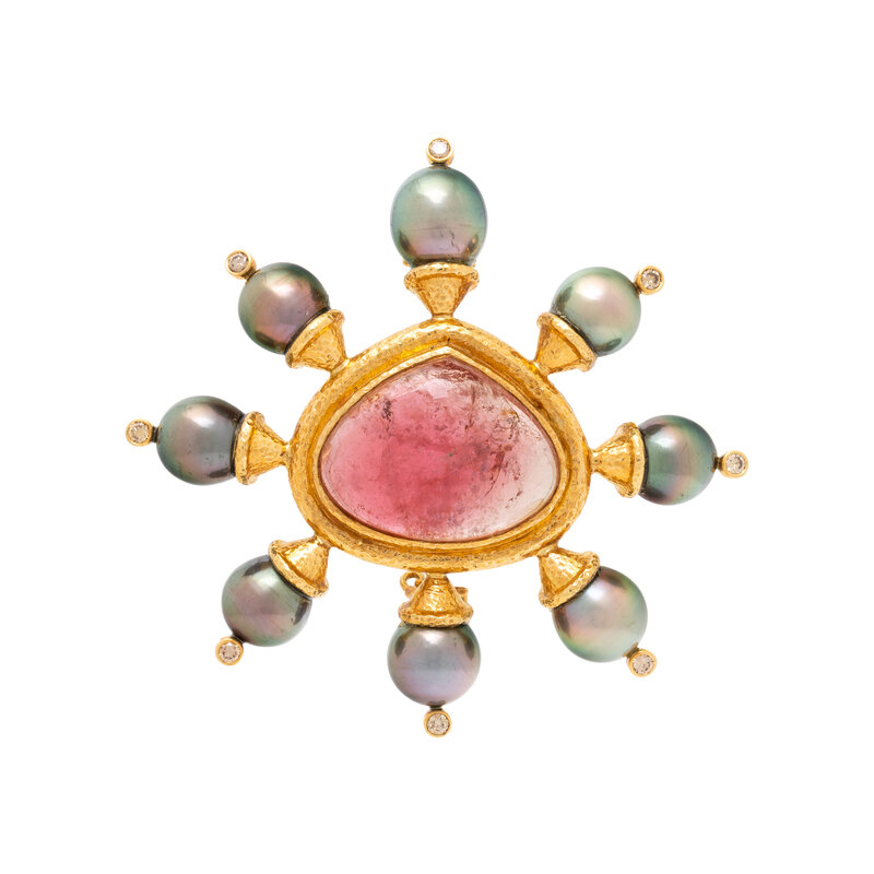 PINK TOURMALINE, GRAY CULTURED PEARL, DIAMOND, AND YELLOW GOLD BROOCH