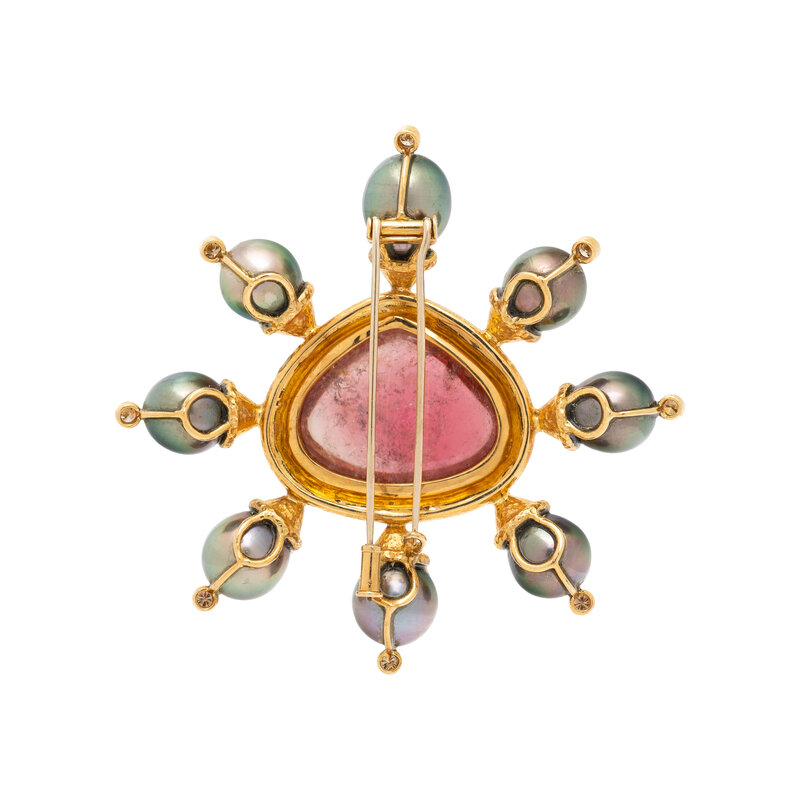 Pear cabochon pink tourmaline measuring approximately 26.15 x 20.00 mm, gray cultured pearls measuring approximately 9.80 - 10.75 mm, and round brown diamonds (origin of color not tested). 18 karat yellow gold. 2 3/4 x 2 5/8 inches.
