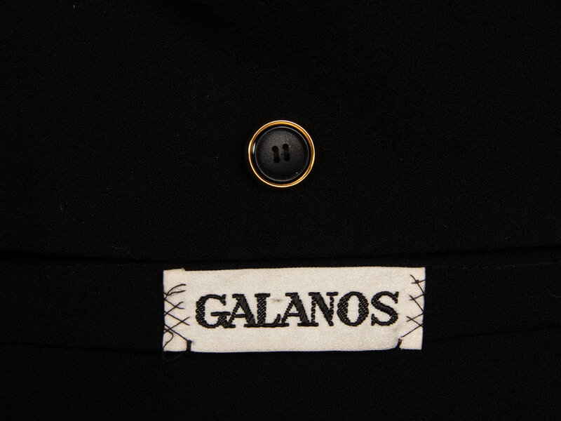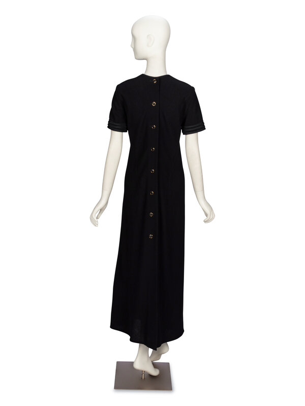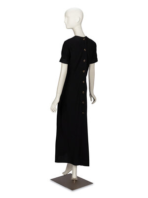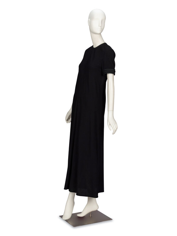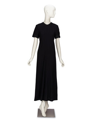 A-line evening gown in black wool crêpe. Round collarless neckline. Use of bias cut throughout. Short sleeves with black woven appliqués at sleeve hems. Button closures at back of dress; knee-high slit at back hem. Dress fully opens at back. Unlined.