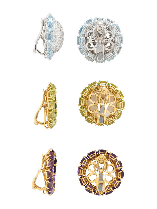 Three pairs of earrings set with oval cut peridots, amethysts, and aquamarines, one pair of button inserts set with round diamonds weighing approximately 4.00 - 5.00 carats total, and one single mother-of-pearl button insert. 18 karat yellow and white gold. Earrings: 1 1/8 inches long. Inserts: 7/8 inch long.