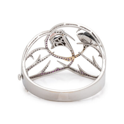 Pavé-set with round diamonds weighing approximately 1.10 carats total, round pink sapphires, and two quartz doublets, hinged with side clasp. 18 karat white gold. 6 1/4 inches inner circumference.