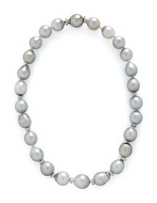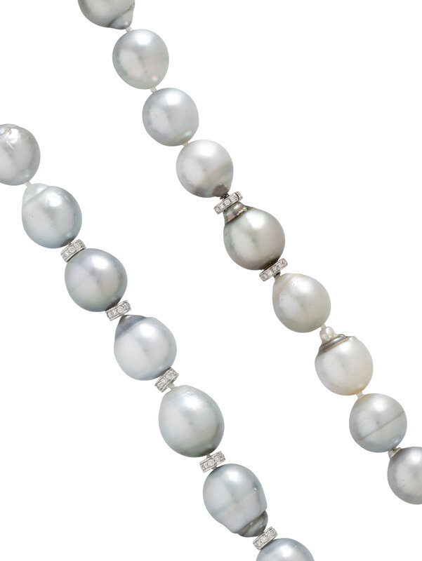 Gray cultured pearls measuring approximately 15.50 - 19.50 mm and round diamonds weighing approximately 1.85 carats total. White gold. 20 inches long.