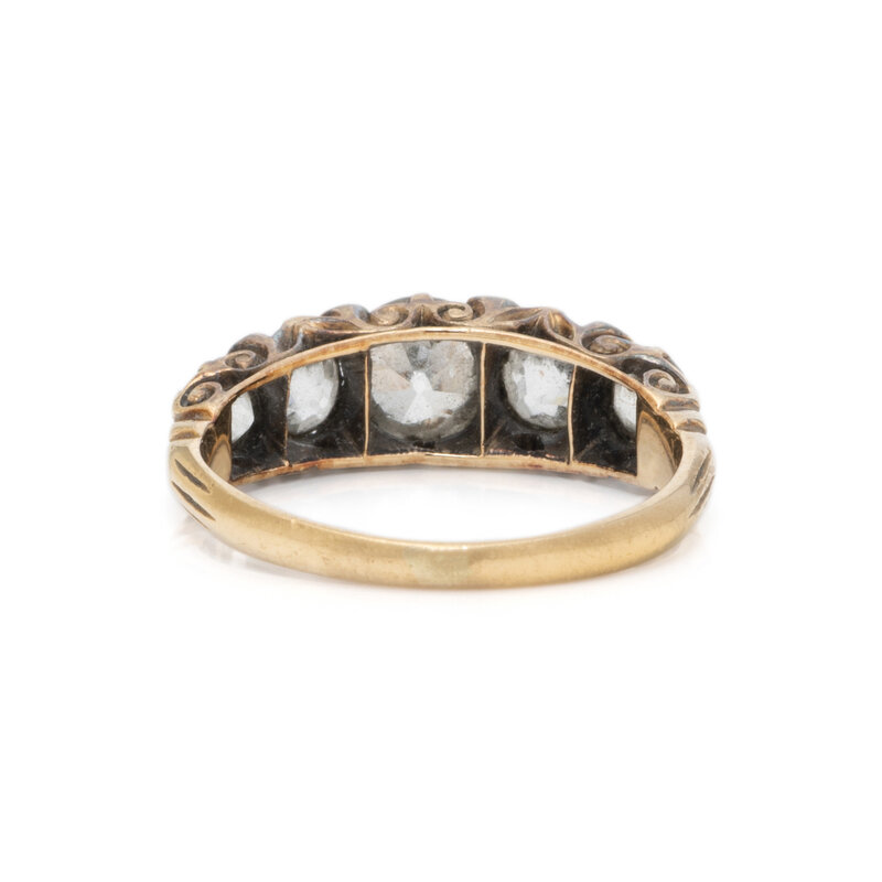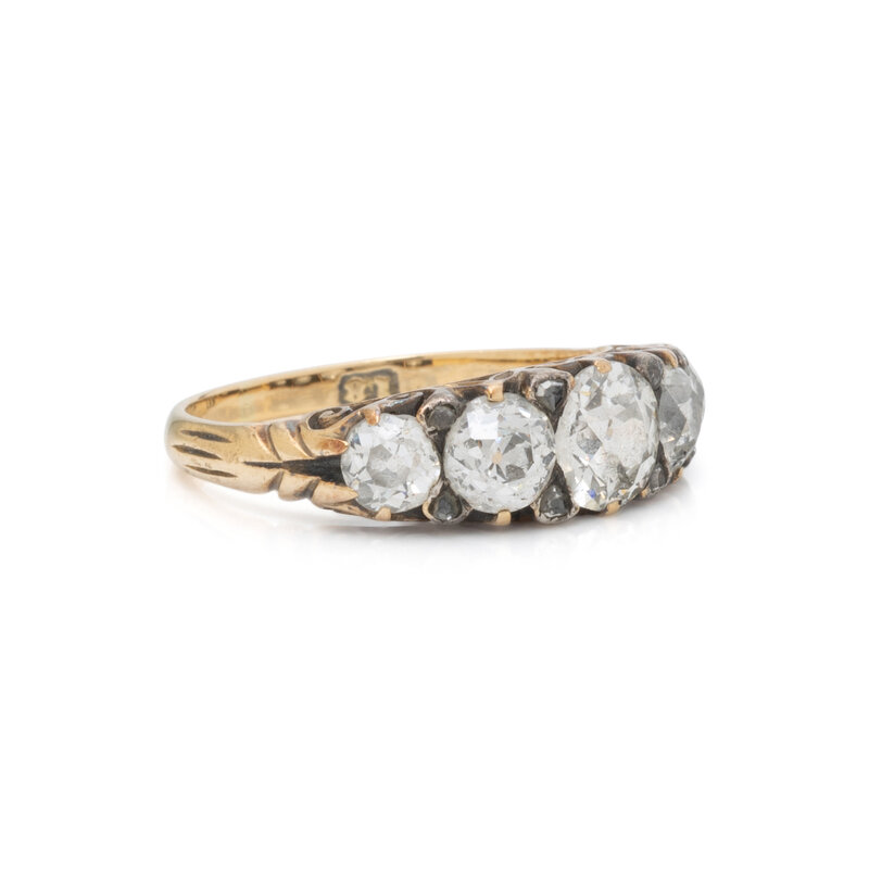 Old mine cut diamonds weighing approximately 2.00 carats total by formula and rose cut diamonds. 18 karat yellow gold. Ring size 6.