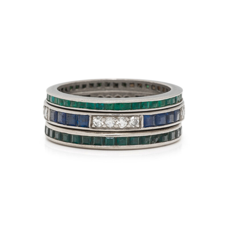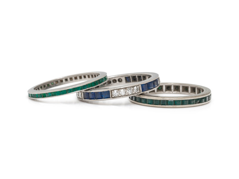 One set with square emeralds, one set with square green glass, and one set with square sapphires and single cut diamonds. Platinum and white gold. Emerald ring size: 6 1/2. Green glass ring size: 6 1/2. Sapphire ring size: 7.