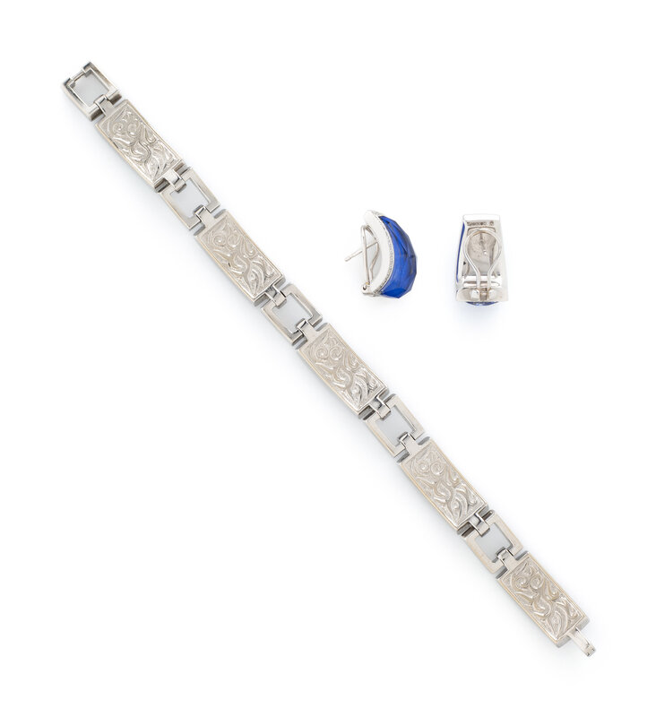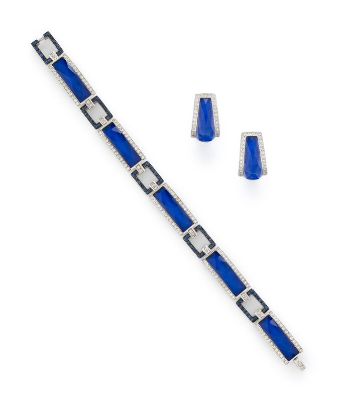 The bracelet set with blue quartz doublets, round diamonds weighing approximately 0.90 carat total, and round sapphires, and the earrings set with blue quartz doublets and round diamonds weighing approximately 0.35 carat total. Bracelet: 6 7/8 inches long. Earrings: 3/4 inch long.