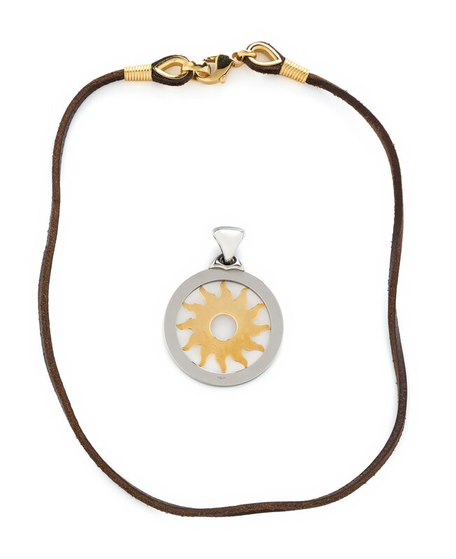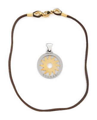 BULGARI, YELLOW GOLD AND STEEL SUN PENDANT AND BROWN LEATHER CORD