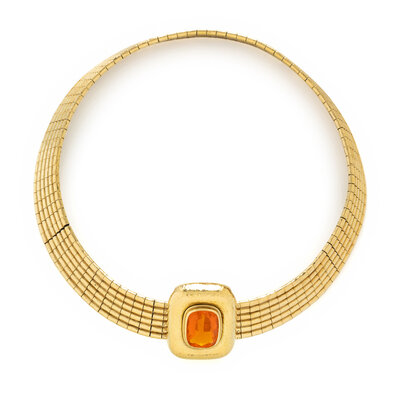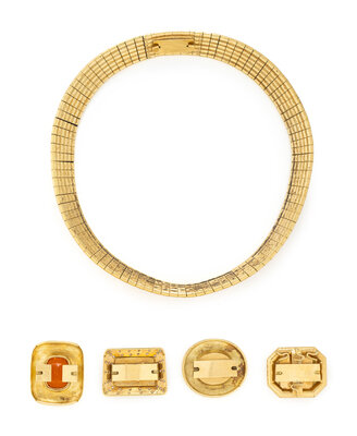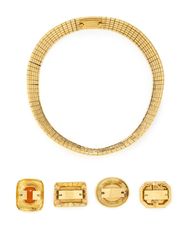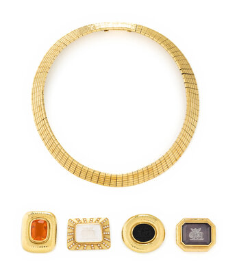 Flexible necklace comprised of gold links strung over rubber, with five interchangeable clasps, one in matching yellow gold, one with an elongated cushion cut fire opal, one with an oval onyx with intaglio depicting an angel and a lion, one with emerald cut rock crystal with intaglio depicting an angel and a lion, and one with rectangular rock crystal backed with mother-of-pearl with intaglio depicting an angel and a lion and round diamonds weighing approximately 0.55 - 0.65 carat total. Yellow gold. Necklace: 16 3/4 inches long. Clasps: 7/8, 1 3/8, 1 3/8, 1 1/4, and 1 3/8 inches long.