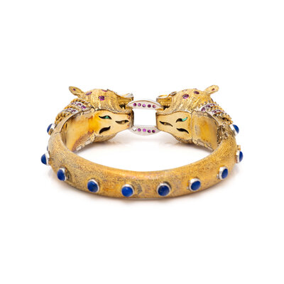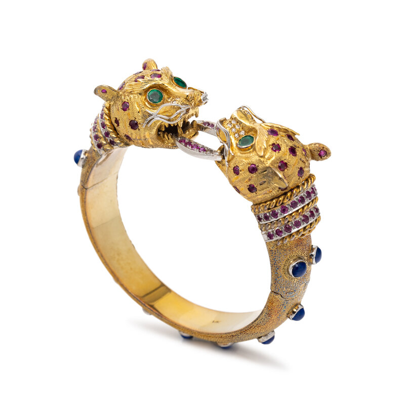 EMERALD, RUBY, DIAMOND, LAPIS LAZULI, AND YELLOW GOLD LEOPARD BANGLE BRACELET