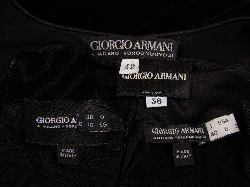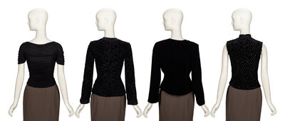 Faux-jacket top in black stretch-blend cut velvet with black satin trim throughout. High stretch content. V-neckline with flat satin collar and faux-jacket front. Light padding at shoulders. Full-length set-in sleeves with functioning buttoned cuffs. Fitted bodice. Invisible zipper closure at back. Unlined.