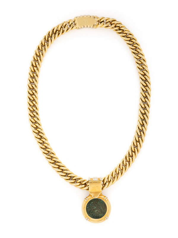 Ancient Sicilian coin measuring approximately 18.70 mm wide. 18 karat yellow gold. Pendant: 1 1/2 x 1 inches . Chain: 16 1/8 inches long.