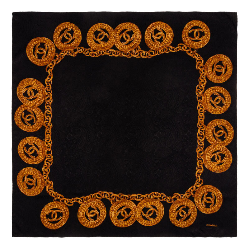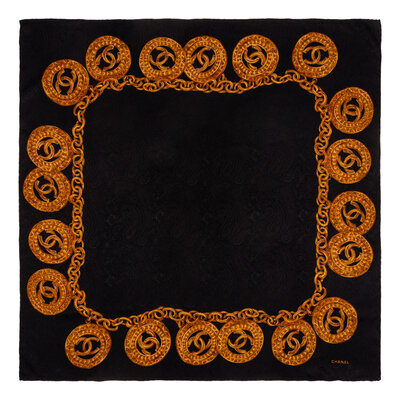 Scarf in black silk jacquard with a gold chain-printed motif. Features rolled and hand-stitched edges.