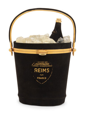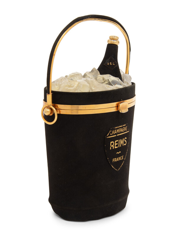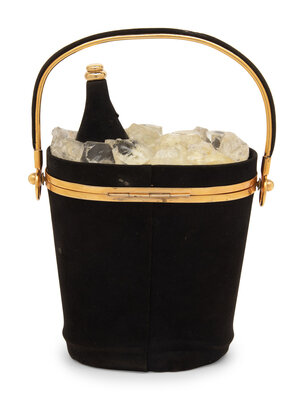 Designed as an ice bucket with Champagne bottle, topped with Lucite ice cubes, the black suede exterior inscribed 'Champagne, Reims, France', opening to reveal a large interior compartment and interior pocket. Signed Anne-Marie, 228, Rue de Rivoli, Hôtel Meurice, Paris at interior lid.