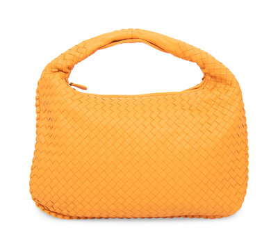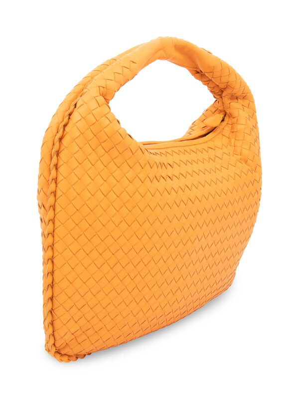 Hobo bag in tangerine orange intrecciato woven leather. Zipper closure and integrated leather handle.