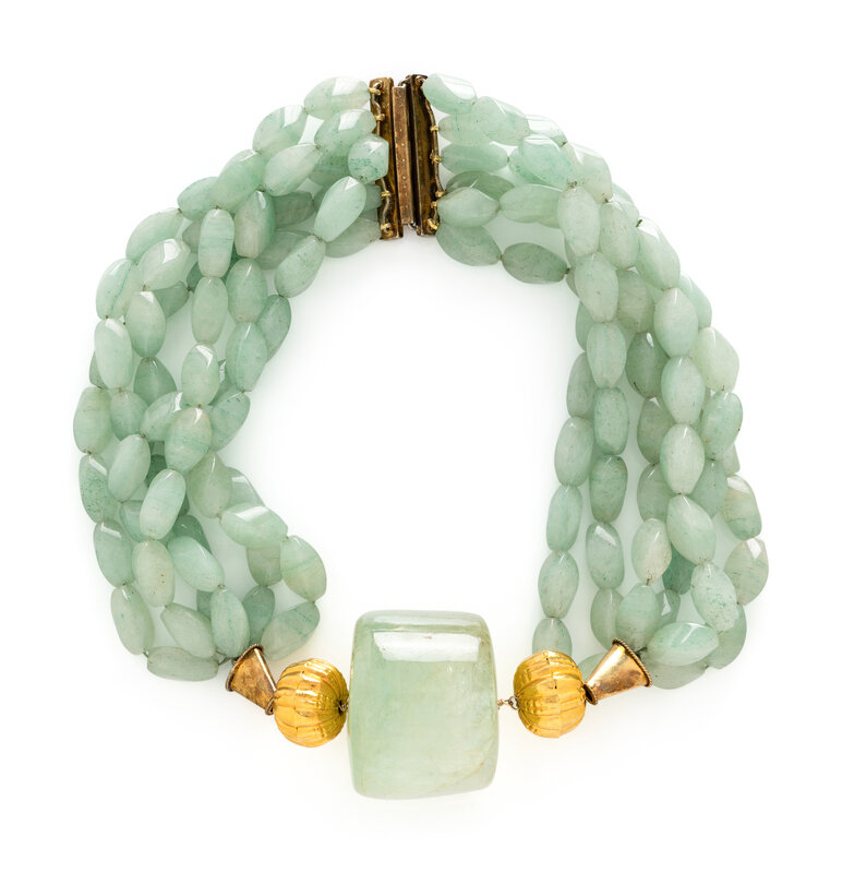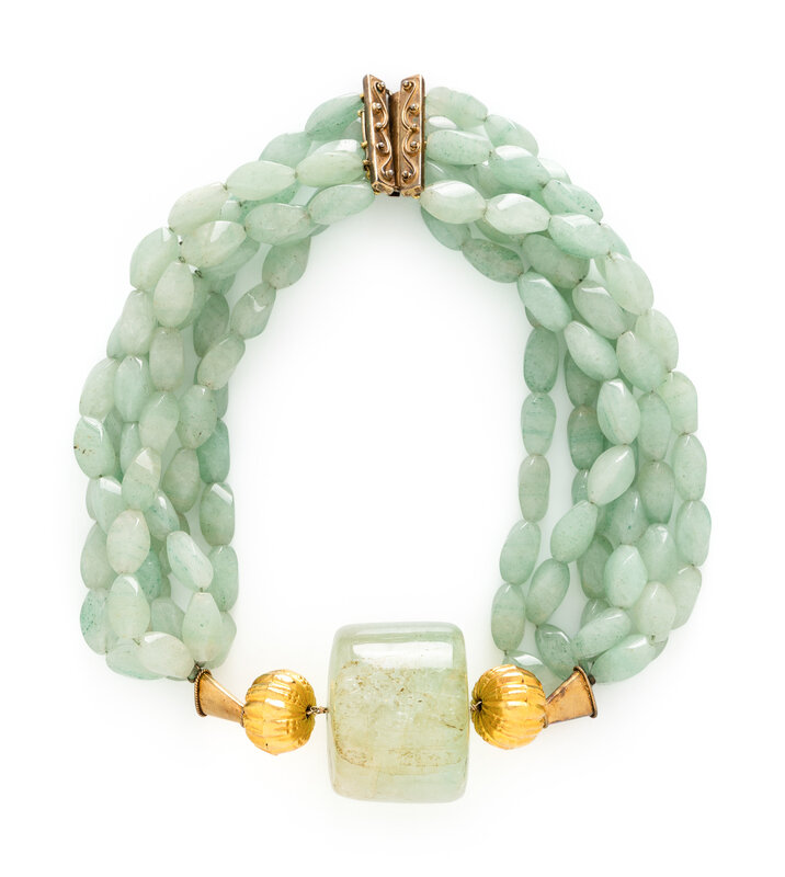 Six strings of tumbled aventurine quartz beads measuring approximately 11.00 x 19.00 mm each and a central cylindrical beryl bead measuring approximately 47.00 x 40.00 mm. Yellow gold-tone metal. 21 inches long.