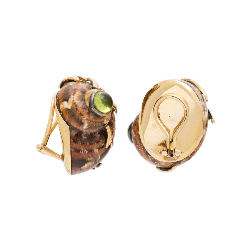 Shells set with round cabochon peridots. 14 karat yellow gold. 1 inch long.