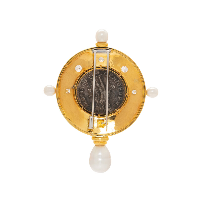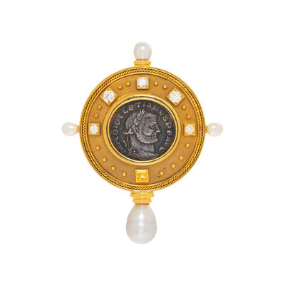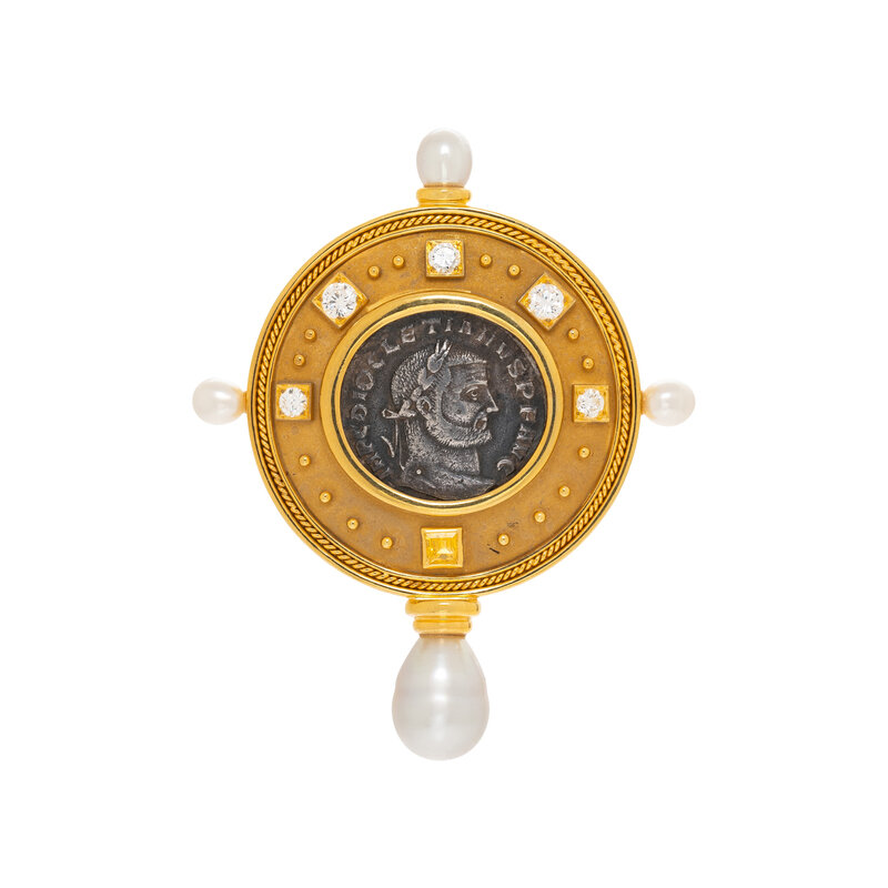 COIN, DIAMOND, CULTURED PEARL, AND YELLOW GOLD BROOCH